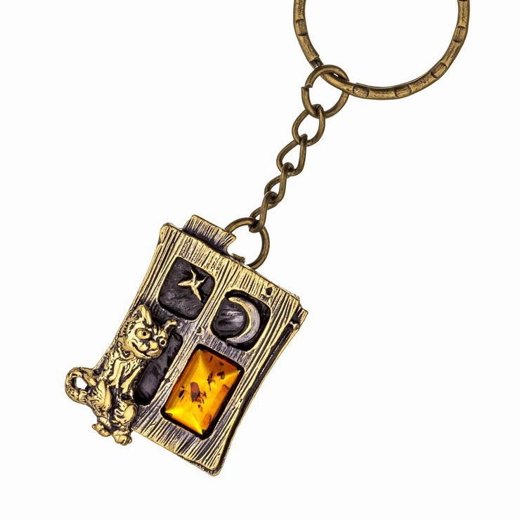 Брелок кот в окошке с янтарем, бронза, янтарь