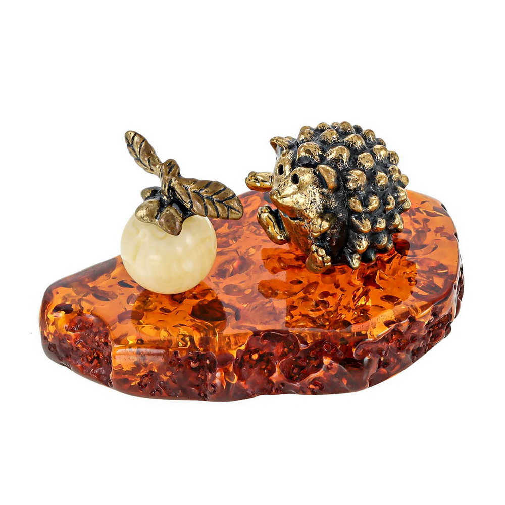 Сувенир Ежонок с яблоком, бронза, янтарь