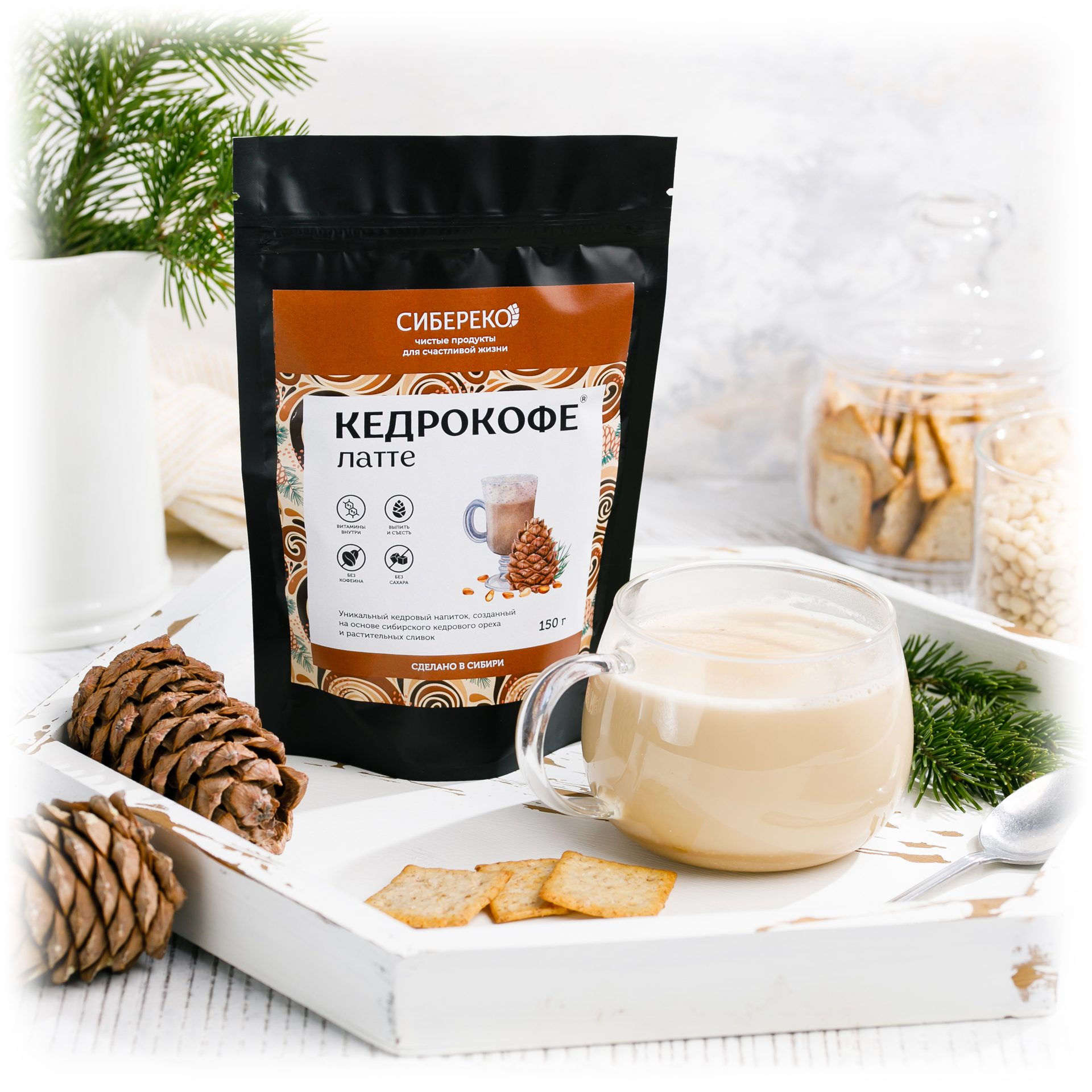 В состав напитка входит обжаренный жмых кедрового ореха, экстракт чаги и заменитель сливок на растительной основе. Напиток обогащен витаминами группы B.