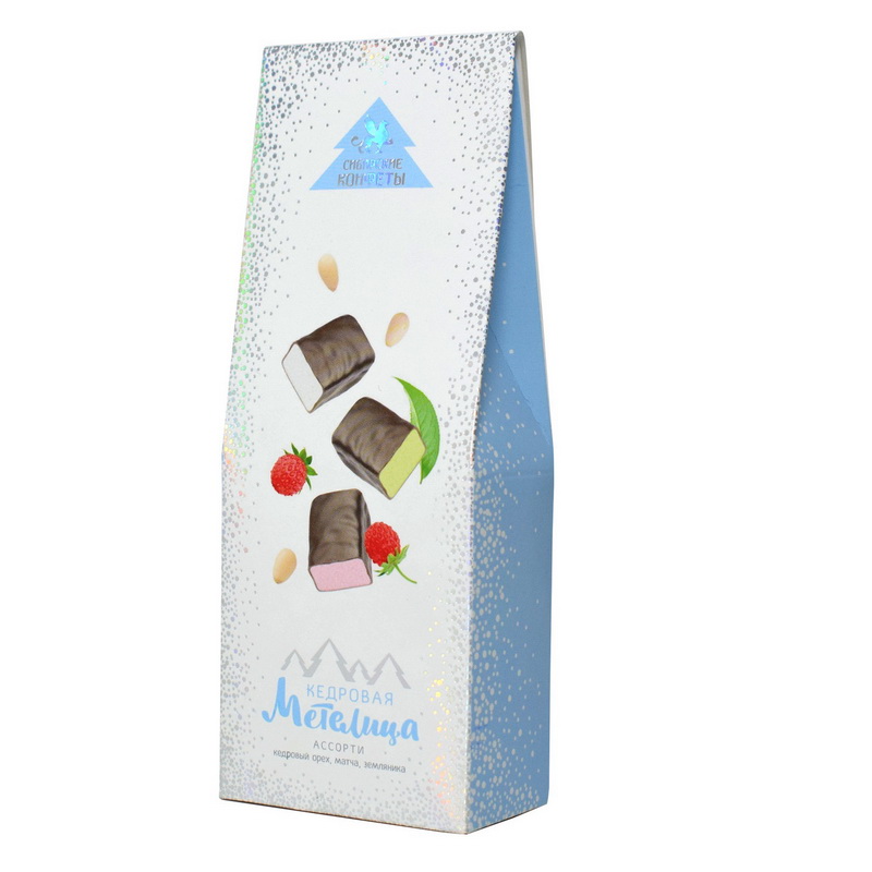 «Кедровая метелица» — это нежное молочное пралине с добавлением кедрового ореха, лесной земляники и японского чая матча, покрытое шоколадной глазурью. Откроет для вас новые вкусовые впечатления. Настоящий фейерверк сибирских вкусов и японской экзотики: кедровый орех, земляника и вкус натурального японского чая Матча. Конфеты, созданные удивлять! Состав: шоколадная глазурь (сахар, масло какао, какао-порошок, лецитин соевый (эмульгатор)), сахар, молоко сухое цельное, ядро кедрового ореха, масло кокосовое, эквивалент какао-масла, земляника сублимированная, экстракт свеклы, матча, экстракт земляники. Срок годности: 6 месяцев.